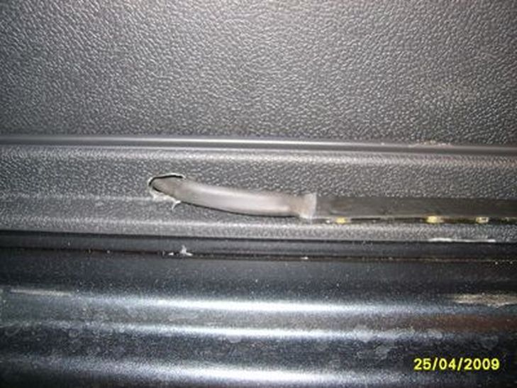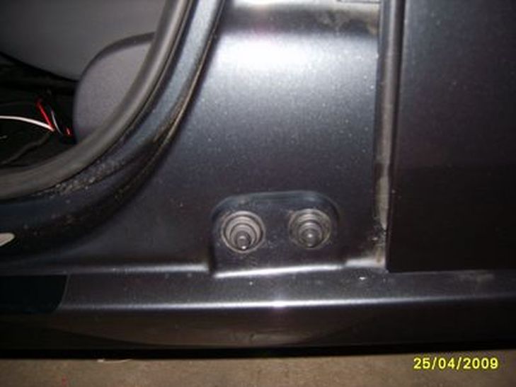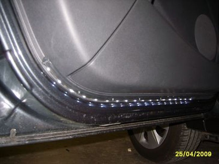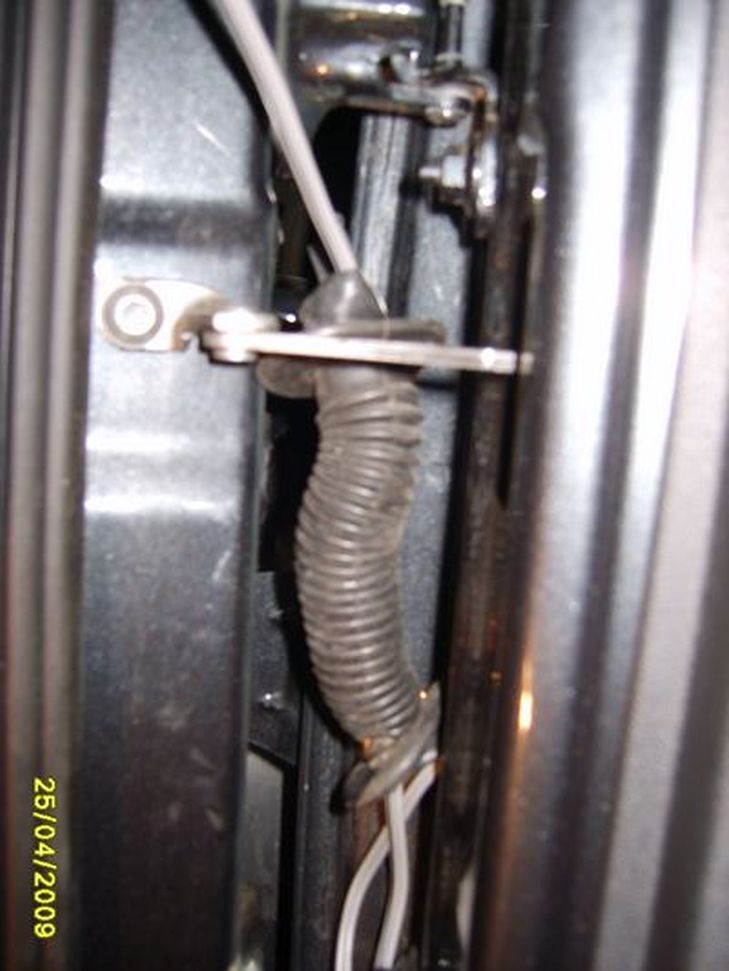 deur komt, zal deze door de doorvoertule moeten (foto 6). Uiteraard is dit iets waarbij je even geduld moet hebben;je hebt daar niet veel plaats om te werken. Door een gaatje te boren in de deurbekleding aan de onderzijde is het mogelijk om de kabel naar binnen te voeren van de LED-