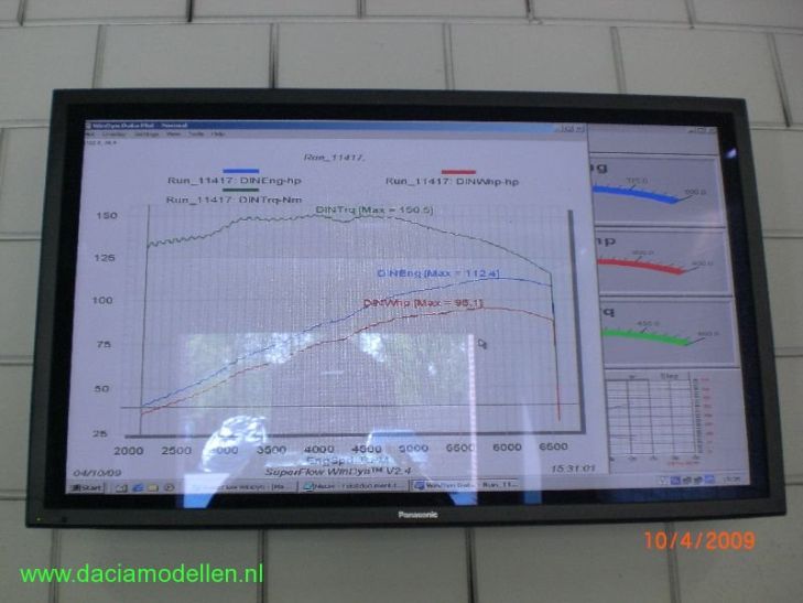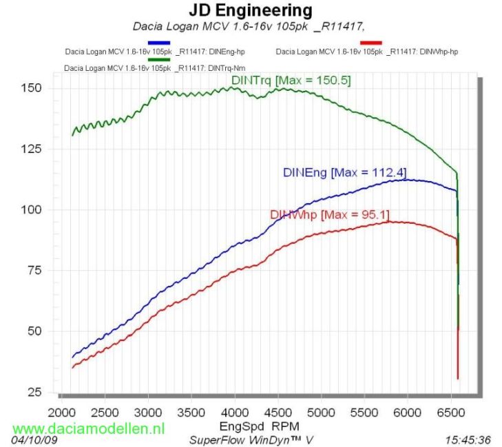 Deze rollenbank doet dat door de weerstand te meten tijden het gas loslaten totdat de wielen weer op stationair toerental meedraaien. De fabrikanten ( en dus ook Dacia ) geven het vermogen aan dat de motor geeft ZONDER aandrijving. Echter het vermogen dat via de wielen op straat wordt over gebracht is grofweg 10% minder door de verliezen IN de aandrijving. In de grafiek zijn deze waarden te herkennen aan: DINEng = motorvermogen en DINWhp is het wielvermogen. Bij de MCV is dat dus nu 112 PK (105 PK oud)op de motor en 95 PK (94,5 PK oud; 105 - 10%) op de wielen. Het blijkt dat de verliezen in de aandrijving toenemen als ook het vermogen stijgt.