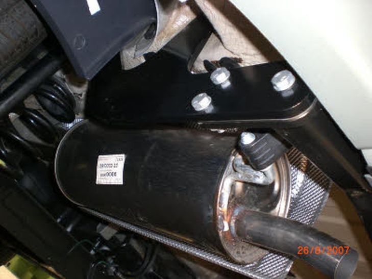 Deze zit dus vlak bij de uitlaat gemonteerd. De trekhaak komt maar net onder de bumper door (foto 12). Ook te zien zijn de bouten waarmee de kogel