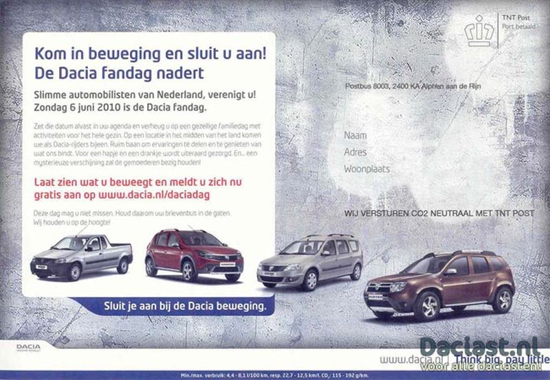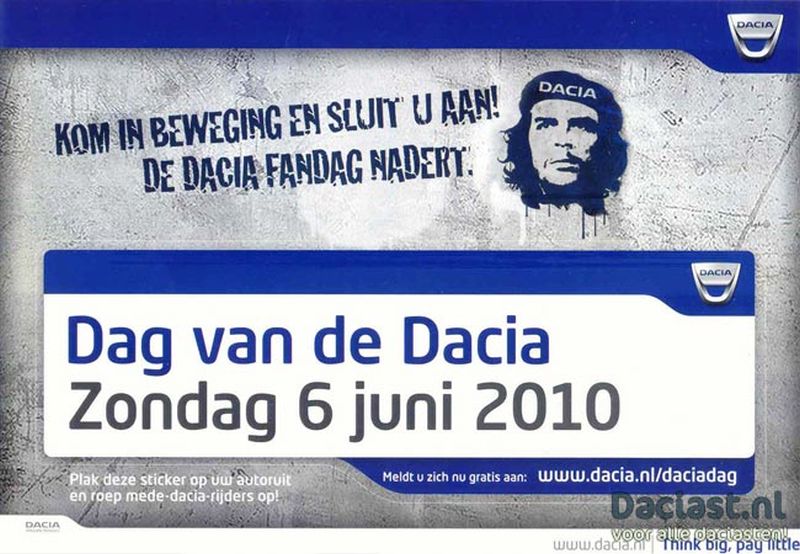 Ruim een maand geleden wisten we al te melden dat de Dacia fandag dit jaar op 6 juni plaats zou vinden. Nu is de officiele bevestiging vanuit Dacia Nederland er ook. Verschillende mensen hebben vandaag onderstaande flyer van Dacia Nederland toegezonden gekregen, met daarop een sticker voor op de auto. Voor de volledigheid vind je hier de volledige tekst van de flyer. Kom in beweging en sluit u aan! De Dacia fandag nadert. Slimme automobilisten van Nederland, verenigt u! Zondag 6 juni 2010 is de Dacia fandag. Zet die datum alvast in uw agenda en verheug u op een gezellige familiedag met activiteiten voor het hele gezin. Op een locatie in het midden van het land komen we als Dacia-rijders bijeen. Ruim baan om ervaringen te delen en te genieten van wat ons bindt. Voor een hapje en een drankje wordt uiteraard gezorgd. En... een mysterieuze verschijning zal de gemoederen bezig houden. Laat zien wat u beweegt en meldt u zich nu gratis aan op www.dacia.nl/daciadag Deze dag mag u niet missen. Houd daarom uw brievenbus in de gaten. Wij houden u op de hoogte! [image=collection,2010,daciadag2010[/image]