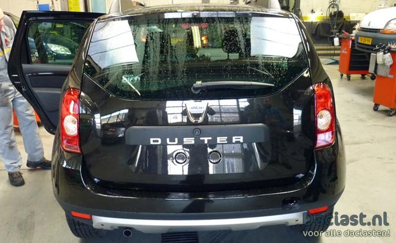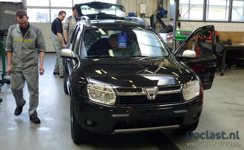 Bij Bochane in Zeist kwam de vrachtwagen zoals gebruikelijk wat auto's afleveren. Alleen stond er deze keer wel een heel bijzondere tussen; de eerste Duster van Nederland! Hoewel niet bedoeld voor de Bochane-vestiging, wisten de medewerkers de vrachtwagenchauffeur over te halen de Duster toch even eraf te rijden, om wat plaatjes te kunnen schieten. De Duster is een Laureate uitvoering, in Noir Nacre gespoten, en voorzien van het zogenaamde Pack Look. Zwart staat 'm in ieder geval erg goed, en het Pack Look laat dat extra goed uitkomen! Komen we ook gelijk bij het (wellicht) mooie nieuwtje: volgens de vrachtwagenchauffeur was deze Duster bestemd voor een LPG-inbouwbedrijf, om zo een typegoedkeuring voor Nederland te kunnen verkrijgen.