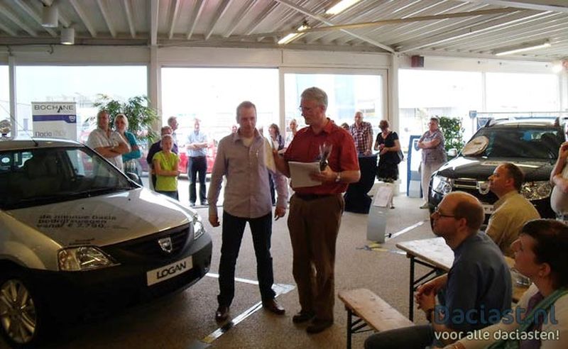 Zondagochtend 25 april kwamen de deelnemers aan de tweede puzzeltocht uit alle windstreken van Nederland naar de Hazenkamp in Arnhem gereden, waar ze door het team van Bochane allerhartelijkst werden ontvangen met een kopje koffie, thee of frisdrank. Veel deelnemers maakten tevens van de gelegenheid gebruik om de aanwezige Dacia Duster in de kleur Noir Nacre uitgebreid te bekijken. Hierbij waren de ooh's en aah's niet van de lucht en viel er slechts sporadisch een kritische noot te beluisteren. Gezien de vele positieve reacties op dit nieuwe model is de verwachting gerechtvaardigd dat Dacia ook met deze auto weer flink gaat scoren. Peter voorzag intussen de deelnemers van de puzzeltocht van een routebeschrijving en vragenlijst en door zijn Bochane collega's werd aan iedereen ook nog een rijkelijk gevuld lunchpakket uitgereikt. Joris zorgde er voor dat alle rijders voor het vertrek met hun auto nog op de gevoelige plaat werden vastgelegd. Daarna was het aan de puzzelaars om de tocht tot een goed einde te brengen. In de loop van de middag keerde iedereen weer druppelsgewijs op het vertrekpunt terug. De een vond de rit en de gestelde vragen uitermate moeilijk, en een ander vond het allemaal wel meevallen. Iedereen zei wel genoten te hebben van een prachtige tocht door een mooi stukje natuur. Jammer dat een pontje vanwege de lange wachttijden sommige deelnemers in tijdnood had gebracht. Na afloop werd onder het genot van een drankje nog uitgebreid nagepraat. Nadat ook de laatste deelnemer binnen was, vond omstreeks 17.00 uur de prijsuitreiking plaats. Daarna keerde iedereen weer huiswaarts, de prijswinnaars met een mooie waardebon, te besteden bij Bochane, en sommige anderen met een offerte op zak voor een Duster en zelfs een iemand met een koopovereenkomst voor deze bijzonder mooie auto. Rest mij alle medewerkers van Bochane Arnhem te danken voor hun gastvrijheid, de goede verzorging van de lunchpakketten, en voor de moeite die zij zich getroost hebben ook dit jaar weer een prachtige puzzeltocht voor te schotelen. We kijken nu al weer uit naar de puzzeltocht van 2011! Klik op een van onderstaande foto's voor een vergroting. Met dank aan Joris voor het maken van de foto's!