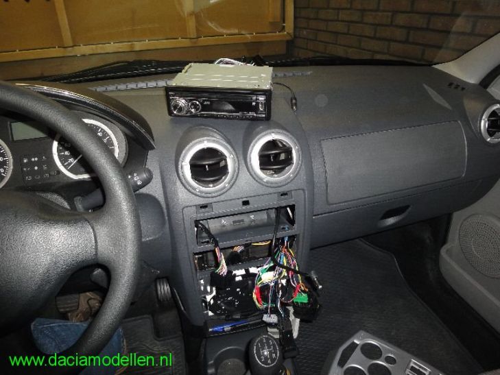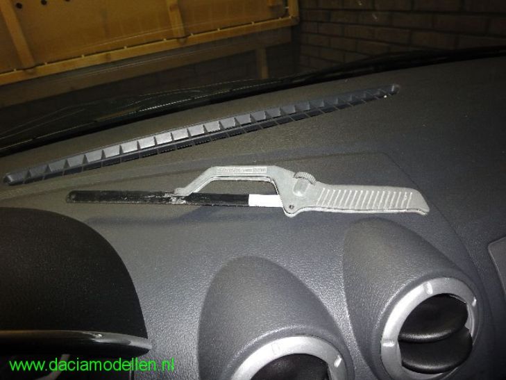 Zo, de schakelaars hebben we allemaal een plaatsje gegeven. En dan volgt nu nog de radio zelf. Het frontpaneel van de Dacia heeft standaard alleen ruimte voor een 1 DIN (enkel-din) radio. Om ruimte te maken voor een 2 DIN moesten de schakelaars verplaatst worden. Nu kan het leuke deel beginnen. Na het verwijderen van het frontpaneel dat met 6 veerklemmetjes vastzit komt de eigenlijke middenconsole in zicht. Het dashboard van Dacia bestaat uit één stuk zoals te zien hiernaast op de afbeelding. De originele blaupunkt radio had ik al eens vervangen door de JVC-radio die ik nu kan verwijderen. Als de radio weg is, is goed de schacht te zien voor de originele 1 DIN montage. En daar moet ik nou juist vanaf! En dat betekent gewoonweg de handzaag erbij om de overbodige delen weg te zagen. Ik gebruik hierbij een speciaal handvat waar je een ijzerzaagje in vast kunt klemmen zodat de andere zijde van de zaag vrij is; hiermee kun je in kleine openingen toch nog zagen. Direct voorin de middenconsole moet ik 2 verbindingen loszagen. Dat deel zit vervolgens met 2 pompnagels vast aan een andere steun die daar weer achter zit. Deze steun zorgt ervoor dat de kanalen die de lucht vervoeren naar de middelste uitstroomopeningen op hun plek blijven. Toch moet er een stuk van deze steun worden verwijderd om voldoende diepte te krijgen.
