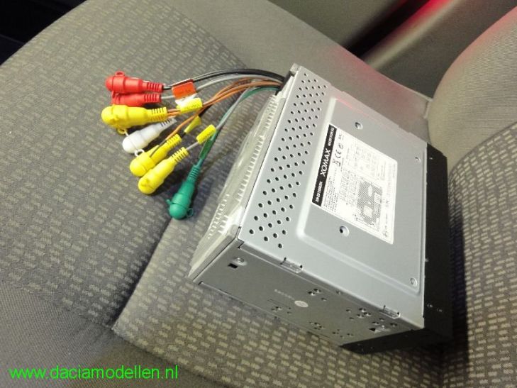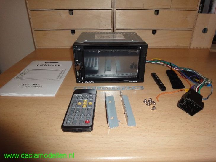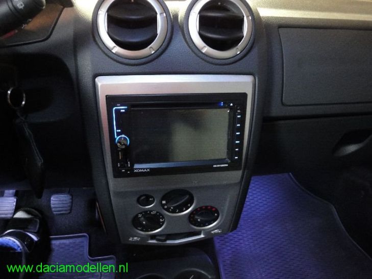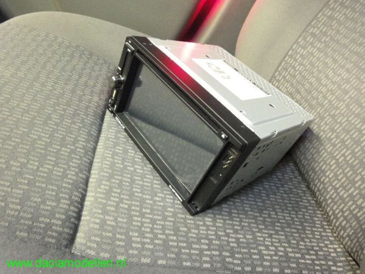 Nu volgt het 7e en laatste deel van de "workshop" om een dubbeldin systeem in de Dacia te plaatsen. De laatste werkzaamheden die nog uitgevoerd moeten worden zijn simpel: Nadat het middenpaneel in kleur gespoten is (en dus droog is), kan deze weer geplaatst worden. Officieel heeft het paneel zoals al eerder genoemd 6 veerklemmtjes dat het paneel vast houdt. Echter de middelste 2 veerklemmetjes (net onder de 2 DIN opening aan de achterzijde van het paneel) heb ik niet nodig. Door het aanbrengen van het extra plexglas front is het geheel behoorlijk stevig geworden. De middelste veerklemmetjes heb ik dus verwijderd; dit maakt montage ook wat makkelijker. nadat het paneel geplaatst is (secondenwerk) kan de radio gemonteerd worden. De radio is een verhaal apart. Uiteraard ben ik gaan rondkijken bij diverse winkels voor een leuk systeem voordat ik ook maar ging beginnen aan de ombouw. Daar hingen dan ook leuke prijsjes aan. Een navigatiesysteem hoefde ik er niet bij in te hebben. Ten eerste stijgt daarmee de prijs behoorlijk, en ten tweede heb ik een goedwerkende TT die zonder moeite gewisseld kan worden tussen mijn auto en de auto van mijn vrouw. Uiteindelijk heb ik ervoor gekozen om via EBAY een dergelijk systeem aan te schaffen. Probleem is dat er vele worden aangeboden waardoor je bijna geen keus kunt maken. Wat het ene systeem niet heeft, heeft het andere systeem wel weer en andersom. Ik heb mijn keus laten vallen op een 2 DIN systeem van het (mij onbekende) merk XOMAX.