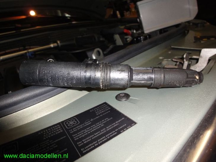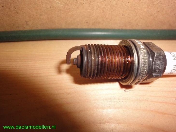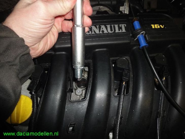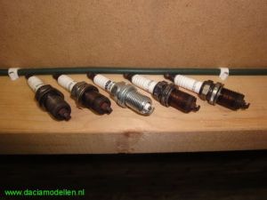 - een centrale geleider die de stroom geleidt. Dit is bij de bougies die Dacia gebruikt niet anders. Als "onze" Dacia met benzinemotor geleverd wordt dan is deze voorzien van bougies van merk CHAMPION, type RC87YCL. Dit type gebruikt Dacia (Renault) al jaren als produkt voor eerste montage en voldoet goed. Mijn MCV heb ik ondertussen uit de garantie gereden zodat ik het onderhoud nu zoveel mogelijk zelf ga doen. Want hoewel de Dacia-prijzen redelijk zijn te noemen, is nog nog wel wat te verdienen als je het onderhoud zelf kunt doen. De teller van mijn MCV staat nu bijna op 60.000 km en volgens het boekje moeten dan de bougies vervangen worden. Dus eventjes naar de dealer geweest om bougies aan te schaffen. Na het inleveren van wel 34,[euro=46] werd ik eigenaar van 4 nieuwe bougies. Ik schreef net al dat er origineel bougies van het type CHAMPION RC87YCL zijn geplaatst. Als vervanger heb ik nu bougies meegekregen van het merk Renault, artikelnummer R77 00 500 155 UV1. Met de bougies in mijn bezit kon ik beginnen aan een (eenvoudige) klus om deze zelf te vervangen. Bij mijn vorige auto's deed ik dat ook al dus deze klus stelt dan niet zoveel voor. Een bougie heeft een vonkbrug. Dit is de vrije ruimte tussen de gebogen pin aan het uiteinde van de bougie en de elektrode. Volgens de technische gegevens van Dacia moet deze afstand 0,9 mm +/- 0,05 mm bedragen. Nieuwe bougies voldoen hier lang niet altijd aan dus controleer dit en stel de elektrode eventueel bij met gebruikmaking van voelermaatjes. Wordt de afstand door slijtage te groot, dan is er meer spanning nodig om de vonk te laten overspringen, en dit geeft vooral bij het starten moeilijkheden. Is de elektrode afstand achter te klein dan wordt ook de vonklengte te klein. Hierdoor wordt het brandbare mengsel slechter ontstoken. Als je begint met de bougies te wisseln dan zijn er een aantal aandachtspunten: - zorg ervoor dat de motor geheel afgekoeld is (vanwege uitzetting van de verschillende materialen).