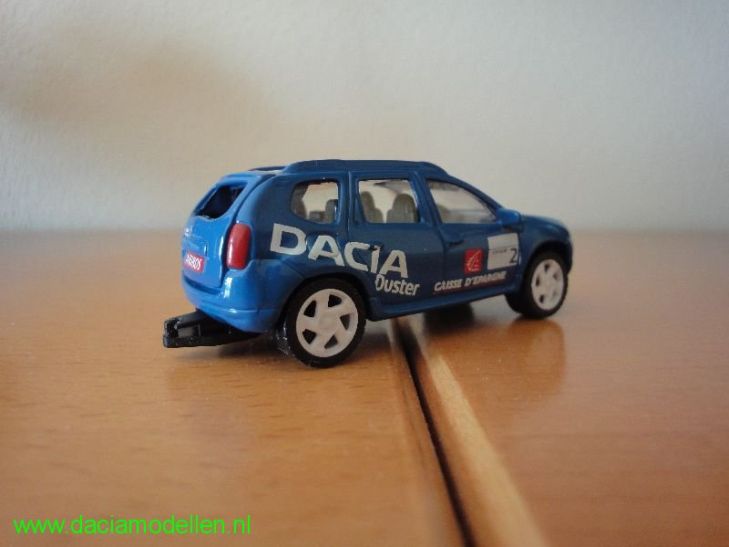 Schaalmodellen van Dacia worden door verschillende fabrikanten gemaakt. Zo heb je bijvoorbeeld ELIGOR als leverancier van de kleine Dacia's. Maar ook NOREV maakt schaalmodellen. Zo heb ik hier een schaalmodel van de Sandero, gemaakt door ELIGOR, een MCV gemaakt door NOREV en een Duster gemaakt door SOLIDO. Vrij recent ben ik een weekje naar Frankrijk geweest om even "uit te waaien". Omdat we maar een korte periode konden gaan hebben we de heen weg in 1 keer gereden (1200 km). We zijn zoals meestal het geval is bij Souillac de A20 afgegaan voor de laatste kilometers. Het was zaterdagmiddag en we konden nog mooi even naar de supermarkt voor de nodige boodschappen. Vanwege het mooie weer bleef ik lekker buiten; vrouw en kind gingen de boodschappen halen. Het duurde echter niet lang of mijn zoon kwam naar buiten rennen met de mededeling: "er hangen hier Dacia's in de schappen". Dus ik ook naar binnen. En warempel, bij de speelgoedafdeling hingen 2 Dacia's (op schaal uiteraard). Gelijk maar besloten om ze beiden mee te nemen. Voor de prijs hoefde ik ze niet te laten hangen: 1,[euro=99] per stuk... Het betrof hier een schaalmodel van de Duster in "ijs"-uitvoering: