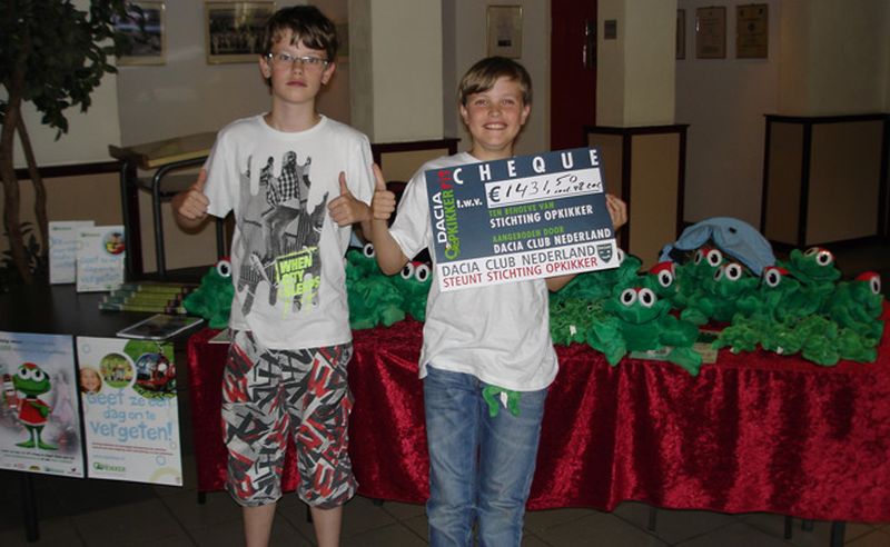 Onder stralende weersomstandigheden werd op zondag 25 september 2011 de Dacia Opkikkerrit verreden vanuit De Muzenhof te Ermelo. Een dag, waarop Daciasten elkaar in een gezellige en gemoedelijke sfeer konden ontmoeten, maar ook een dag met een bijzonder doel: namelijk het inzamelen van geld voor de Stichting Opkikker, een stichting die "opkikkerdagen" organiseert voor gezinnen met chronisch zieke kinderen. 's Ochtends werden alle deelnemers (een kleine zestig) onder het genot van een kopje koffie of een frisdrankje hartelijk welkom geheten door bestuursleden Joost en Mike. Door Nico en Stefana, twee vrijwilligers van de Stichting Opkikker, was nog een informatiekraam ingericht, die druk bezocht werd. Om 11.30 uur werd het vertreksein gegeven en werd iedereen individueel nog even geinstrueerd over de puzzelrit. Om half drie keerde als eerste de familie Dekkers weer terug op de Muzenhof, kort daarna gevolgd door Gregor Diks, die de route helemaal in zijn eentje gereden had en daarom de vragen niet beantwoord had. In het daarop volgende uur sijpelde met korte tussenpozen de rest van de deelnemers binnen. Als organisatie ontvingen we veel complimenten voor de mooie route die we hadden uitgezet. Iedereen had verder zijn of haar best gedaan om de vragen zo goed mogelijk te beantwoorden. Toch bleek na het controleren van de antwoorden dat niemand alle vragen goed beantwoord had. Er waren totaal 65 punten te verdienen en de vijf besten konden een prijs uitzoeken. Als eerste prijswinnaar kwam de familie Plompen uit de bus met 61 punten, een goede tweede was de familie Broekhuizen met 60 punten, gevolgd door de familie Bolkenbaas met 58 punten, de familie Rohof met 56 punten en de familie Tijink met 54 punten. Na de prijsuitreiking was het tijd voor de overhandiging van een cheque aan Casper Bolkenbaas, jeugdambassadeur van de Stichting Opkikker, die ons op het idee gebracht had een evenement te organiseren voor de Stichting Opkikker. Dankzij een aantal Dacia dealers en Dacia Nederland, maar vooral ook dankzij de financiele bijdrage van alle deelnemers konden we een leuk bedrag aan deze stichting schenken: 1431,50 euro inclusief de waarde van 48 ingeleverde mobieltjes. Na dit "officiele" gedeelte konden alle deelnemers genieten van een overheerlijk buffet. En na een gezellig samenzijn vertrok iedereen weer huiswaarts. Tot slot willen wij als organisatie alle deelnemers en al onze sponsoren nogmaals hartelijk danken voor hun financiele steun. De Stichting Opkikker wensen wij verder heel veel succes toe met het vele goede werk dat zij doen. Graag tot een volgende gelegenheid!