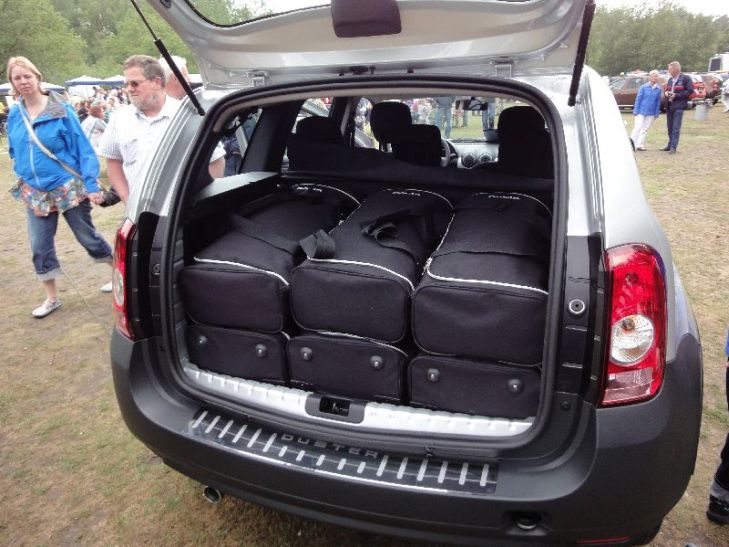 Dacia heeft namelijk een tassenset laten maken die speciaal geschikt is om de kofferruimte van de Duster keurig te vullen! Deze tassenset bestaat uit drie trolleys, dat zijn tassen die voorzien zijn van rolletjes en een uitschuifbaar handvat; daarnaast horen er nog drie zogenaamde weekend-tassen bij.
