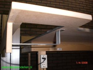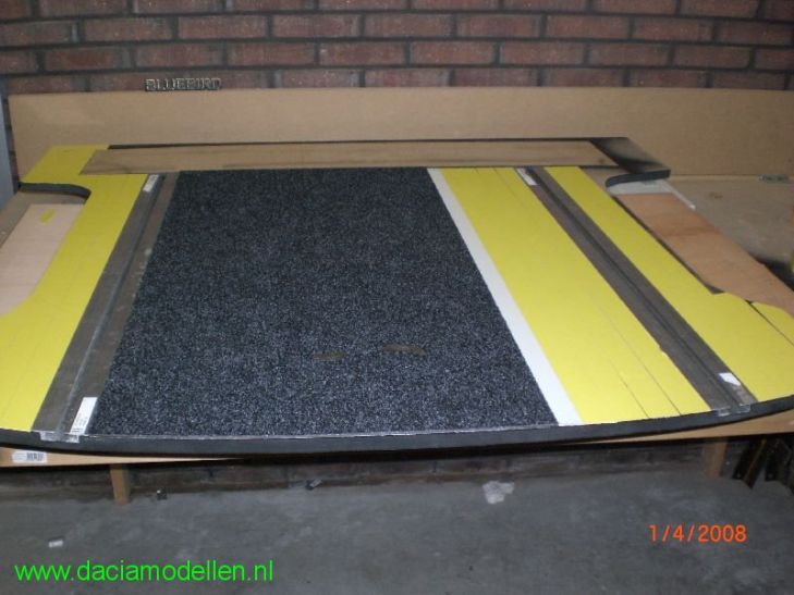 Vervolgens een plaat gezaagd waaraan ook de beide sponningen zijn gemaakt. Als je van te voren alles netjes aftekend dan past het ook meteen. Je kunt beter even wat meer tijd steken in meten. Ik was toch lekker bezig dus heb ik maar meteen verzonken rails gemaakt in de plaat. De bedoeling is om op deze wijze een railsysteem te maken waarmee ik lading kan opsluiten tussen een opstaande plank (te klemmen in het railsysteem) en de achterbank. De lading kan dan niet gaan schuiven. In het opbergvak dat op deze wijze gemaakt is heb ik mooi ruimte voor diverse zaken zoals reserve-ruitenwisserbladen, lampjes, touw en andere zaken die handig zijn om bij je te hebben maar die je niet de hele tijd in zicht wilt. Tevens heb ik hier het PLCt'je geplaatst dat ik in de loop van de tijd zal gebruiken om diverse functies te programmeren voor projekten die ik van plan ben te maken in de auto. Aangezien de originele vloer van de auto donker van kleur is heb ik de randen van de plaat ook donker gemaakt zodat dit beter kleurt. Vervolgens heb ik de hele plaat beplakt met dubbelzijdige tape speciaal voor vloerbedekking. Ik heb bij een zaakje een aantal vloertegels gehaald en deze op de vloer geplakt om een mooi geheel te krijgen. Uiteraard met een speciaal mesje de contouren ook in de vloertegels aangebracht; de afdekplaat van het opbergvak is apart bekleed anders zou ik dit niet kunnen verwijderen. Nu alles mooi beplakt is kan ik deze plaat niet meer uitnemen omdat er geen rand is om vast te pakken. De oplossing is simpel: ik heb aan beide zijden een gaatje geboord, een draad er dubbel doorheen gestoken zodat er een lus ontstaat. Aan de onderzijde van de plaat een knoop in be deide uiteinden van de draad en klaar. Deze vloer zit er nu een aantal jaren in en bevalt nog steeds prima. Hieronder zie je een verzameling van foto's die ik gemaakt heb tijdens het maken van deze vloer: