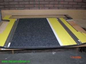 Ik heb destijds in 2007 de MCV gekocht als 5 zitter. Dat betekent dat je in de laadvloer direct achter de 2e zitrij een verlaagd gedeelte hebt. In 2008 ben ik er eens over gaan denken wat ik met dat verlaagd gedeelte zou gaan doen. Ik besloot om een extra laadvloer te maken zodat ik het verlaagde gedeelte kon afdekken. Het artikel over deze laadvloer heeft destijds wel op mijn engelstalige site gestaan. Deze site heb ik inmiddels opgeheven omdat het beheer van deze site en het daciaforum voldoende tijd vraagt. Echter het artikel was nog niet weer geplaatst. Het wordt weer steeds beter weer, in de avond is het steeds langer licht dus er is meestal ook meer zin in klussen. Het volgend stukje is daarom speciaal voor de mensen die zin hebben de handen uit de mouwen te steken. De eerste poging om een vloer te maken bleek een niet voldoende stevige vloer op te leveren. Deze ondergrond heb ik vervolgens gebruikt om een mal te maken voor een nieuwe versie. Ik heb met papier en plakband de contouren van de laadvloer afgetekend. Deze papieren laadvloer heb ik daarna op een plaat van MDF gelegd. Nu was het eenvoudig om deze over te nemen op de MDF-plaat. Met de decoupeerzaag een beetje vorm aan de plaat gegeven waarna deze natuurlijk eerts gepast moest worden. Toen dit goed was heb ik een stuk uit de plaat gehaald. En wel precies boven het verlaagde deel van de originele laadvloer. Met decoupeerzaag heb ik eerst het grootste deel verwijderd; daarna met de bovenfrees de rand strak gemaakt en een sponning aan beide zijden aangebracht.