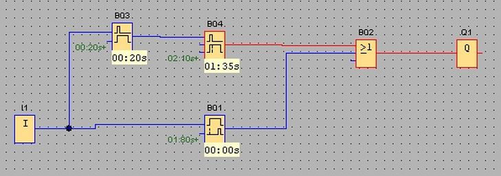 De schakeling werkt als volgt: (zie tekening) Ingang I1 krijgt een signaal vanaf de knipperlichthendel. Ook al houd ik de hendel wat langer vast, er komt maar 1 kort pulsje binnen via het eerste blokje boven. Dit pulsje start een tijdklokje dat een bepaalde tijd actief is. Uitgang 1 wordt bediend waardoor
