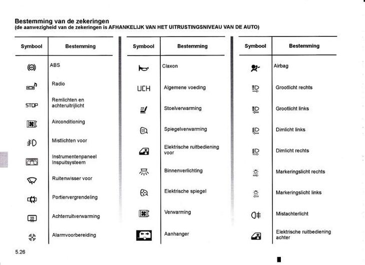 Een auto zit vol met electra en dus componenten die van spanning moeten worden voorzien. Denk bijvoorbeeld aan de radio, de achterruitverwarming, spiegelkverstelling, rammbediening maar ook het lampje in het handschoenkastje. Al deze componenten dien deugdelijk gezekerd te zijn. Dacia heeft dat uiteraard netjes voor elkaar. Een overzicht van de zekeringen vind je aan de binnenkant van de klep die de zekeringen afdekt; in de handleiding staat er ook een mooi overzicht van en die vind je dus hieronder: