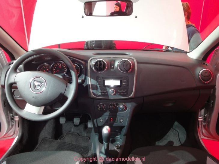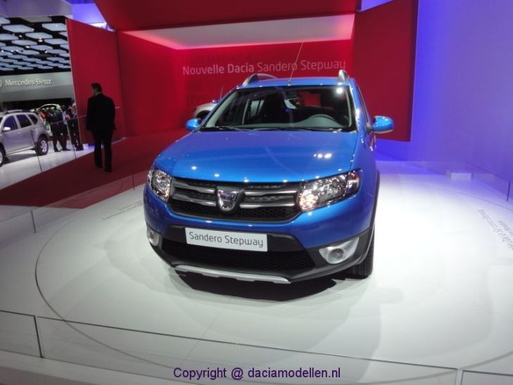 Net als bij de Sedan kan de achterbank omgeklapt worden. Hiervoor is er een drukknop aangebracht bovenin de stoel. Door het indrukken hiervan kun je de rugleuning omklappen. Hierdoor ontstaat eenredelijk vlakke laadvloer. De hoedenplank is eenvoudig uit te nemen waardoor er toch behoorlijk veel ruimte ontstaat. Overigens was geen van de getoonde modellen voorzien van een reservewiel; in plaats daarvan lag er een soort piepschuimen bak in met een tweetal vakken waarin je wat spullen zou kunnen leggen. Het is wel oppassen bij het weer rechtop zetten van de rugleuning. Dit was op de autosalon mooi te zien. Sinda de nieuwe modellen namelijk is het de bedoeling dat de sleutel van de gordel in het sleuf van de bekleding bij de deur wordt geplaatst. Doe je dit niet dan hangt de gordel verder naar achteren, zeker wanneer de rugleuning plat ligt. Zet je de leuning dan omhoog dan hangt de gordel precies voor de pin waarmee de leuning vergrendelt wordt en deze beschadigd dan. Overkomt je dat een paar keer dan krijg je bij de APK een probleem omdat de gordel beschadigd is.Daar waar de Sandero redelijk anoniem vormgegeven is, is de Stepway nu veel meer opvallend gemaakt door al het kunststof wat aangebracht is om de auto een stoerder uiterlijk te geven. Bijvoorbeeld de wielkastbekleding aan de buitenzijde, meer zwart op de voor- en achterbumper, kapjes over de mistlampen en natuurlijk de dakreling.Meer foto's vind je hieronder in het album:![]()