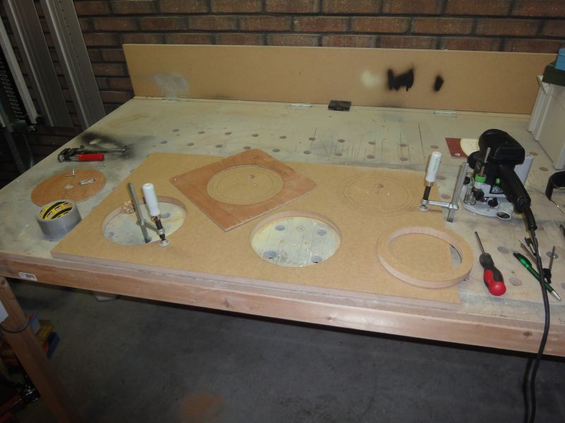 En dat is dus precies wat ik gedaan heb. Ik heb een dunne plaat hout genomen waarin ik een gat met de benodigde diameter gezaagd heb. Dit moest nauwkeurig gebeuren aangezien de rand van dit gat strakt dient als aanslagrand voor de kopieerfrees. Vervolgens deze plaat vastgeschroefd op eens tuk MDF van 18 mm dik. Met de kopieerring in de bovenfrees is het daarna eenvoudig om een ronding te frezen.