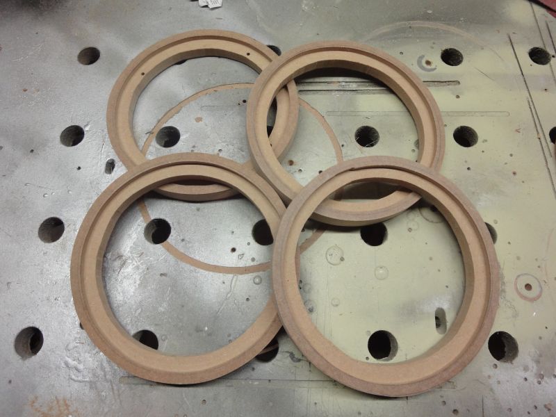 De binnenzijde heb ik met de decoupeerzaag gedaan aangezien je deze binnenrand namelijk niet weer ziet. Vervolgens met de bovenfrees een sponning aangebracht omdat deze luidspreker-ring over de originele houder gemonteerd wordt. Daarna heb ik de gemaakte ringen eerst gepast op de houder in de deur. De ringen zijn echter nog niet klaar; ze moeten nog geschuurd worden en in de lak gezet worden aangezien de binnenzijde van de deur vochtig kan worden en MDF zou dit vocht dan opnemen.