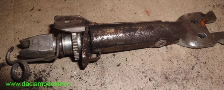 Zodra deze veren verwijderd zijn is de veerkracht van de overige veren nog het enige dat de remschoenen op de plek houdt. Door het voorzichtig naar voren kantelen van de remschoenen pak je het geheel los van de achterzijde. Nu kun je voorzichtig de veren losnemen (begin met de onderste, dit is makkelijker). Als je alles in delen uit elkaar hebt liggen kun je de remschoenen vervangen indien nodig. Zorg ervoor dat je het stelmechanisme schoonmaakt net als het scharnierpunt van de hefboom die op de remschoen gemonteerd is. In mijn geval was het dit scharnierpunt dat het piepende geluid veroorzaakte. Na het schoonmaken en aanbrengen van een beetje kopervet is het weer als nieuw.