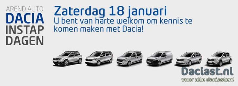 De Randstedelijke Arend Auto bedrijven organiseren voor u de Arend Auto Dacia Instap Dag op 18 januari aanstaande. Tijdens onze Dacia Instap Dag maakt u onder meer kennis met de gloednieuwe Dacia Logan MCV. Een Dacia die door de vakpers inmiddels is geroemd om zijn moderne uiterlijk een zijn unieke prijs-kwaliteitsverhouding. Maar ook de vernieuwde Dacia Duster vindt u in onze showroom. Deze vernieuwde Duster is moderner maar heeft nog steeds dezelfde avontuurlijke kwaliteiten die hem geschikt maken voor alle terreinen. Kortom, twee nieuwe Dacia's die u zeker gezien moet hebben! Maar er is meer! Wat dacht u van de comfortabele Dacia Sandero, de sportieve Sandero Stepway, de ruime Lodgy of de praktische Dacia Dokker (Van) Stuk voor stuk Dacia's die allemaal gemaakt zijn volgens de filosofie van Dacia: betrouwbaar, eenvoudig, compleet en slim! Overtuig uzelf in de showroom van Arend Auto. Tijdens de Arend Auto Dacia Instap dag kunt onder het genot van een hapje en een drankje ongedwongen kennis maken met alle Dacia-modellen. Uiteraard bestaat de mogelijkheid om een proefritafspraak te maken in de Dacia van uw keuze. En tot slot ontvangt u van onze medewerkers na afloop een origineel Dacia cadeau als aandenken. U komt toch ook? Graag verwelkomen wij u op de speciale Arend Auto Dacia Instap Dag op een van onze onderstaande vestigingen!