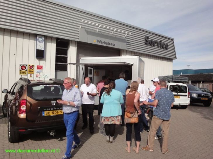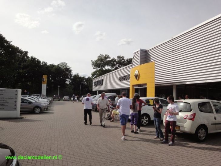 Na een rit van 120 kilometer kwam ik met mijn gezin om 10:00 uur aan bij Autobedrijf Bochane in Nijmegen, het vertrekpunt maar ook de finish. Al gauw werd het een 'lekkere' drukte; in totaal verschenen 27 Dacia's aan de start.