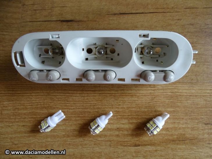 Ik verander niet alleen het armatuur maar vervang de originele lampjes ook direct door LED-versies. Via internet heb ik W5W-leds besteld, uit het verre China (dat overigens met de komst van internet en webshops heel dichtbij is gekomen). Met het wijzigen van de gloeilampjes verandert ook de kleur van de binnenverlichting. Overigens: in tegenstelling tot gloeilampjes maakt het voor deze ledlampjes wel uit hoe ze in het armatuur gezet worden. Plaats je ze namelijk verkeerd om dan doen ze het niet…