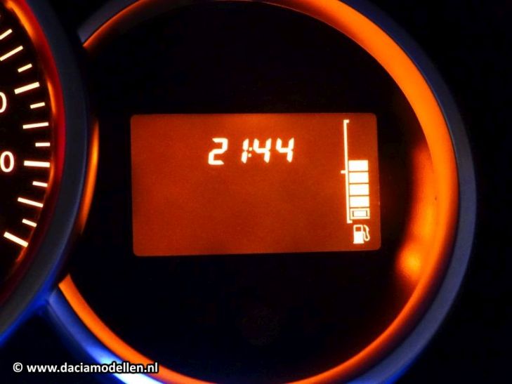 De weergave hieronder zullen velen van ons niet zien. Heb je namelijk een Dacia met het MediaNAV systeem dan wordt deze weergave uitgeschakeld! De tijd wordt namelijk op het MediaNAV systeem weergegeven. Toch is deze tijd niet bij elke weergave zichtbaar. Ik weet ook niet waarom je deze weergave zou moeten uitschakelen. Ik zie deze tijdsweergave dus wel; bij mij is deze nu door mij wel weer geactiveerd: