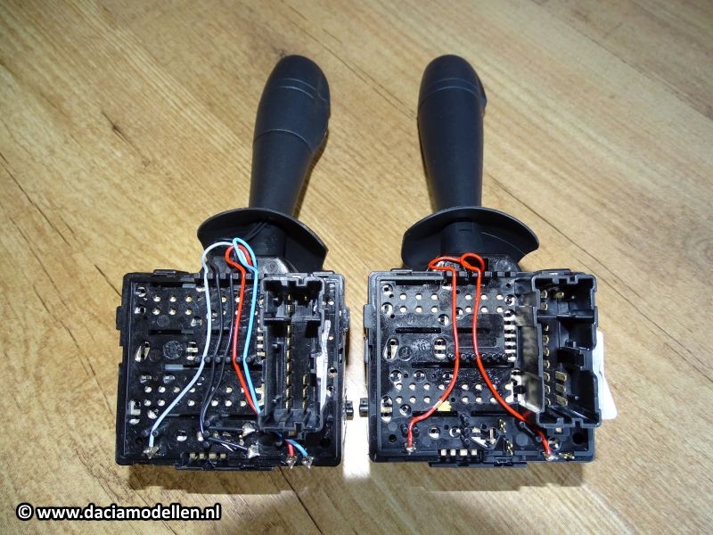 Als ik de schakelaars met aansluitzijde naast elkaar leg dan valt het verschil direct op. De originele hendel heeft twee draden; de hendel van de Clio IV heeft vijf draden!