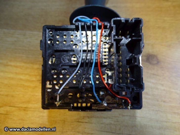 De meest linkse draad bij beide schakelaars is de massa-draad. Bij de hendel van de Clio IV zie je twee zwarte draden; deze zijn van de intervalstanden. De hendel van de Clio IV heeft twee knoppen aan de kopse kant zitten die voorzien zijn van een pijl naar boven en een pijl naar beneden (de rode en blauwe draad horen hierbij). Hiervan werkt er maar één als je de hendel in de Dacia zet (namelijk die met de pijl naar beneden). Ik wil de andere natuurlijk ook een functie geven. Deze kan heel goed dienen als tip-schakelaar voor de ruitenwisser. Maar eigenwijs als ik ben, wil ik graag de beide functies van de twee knoppen omdraaien.