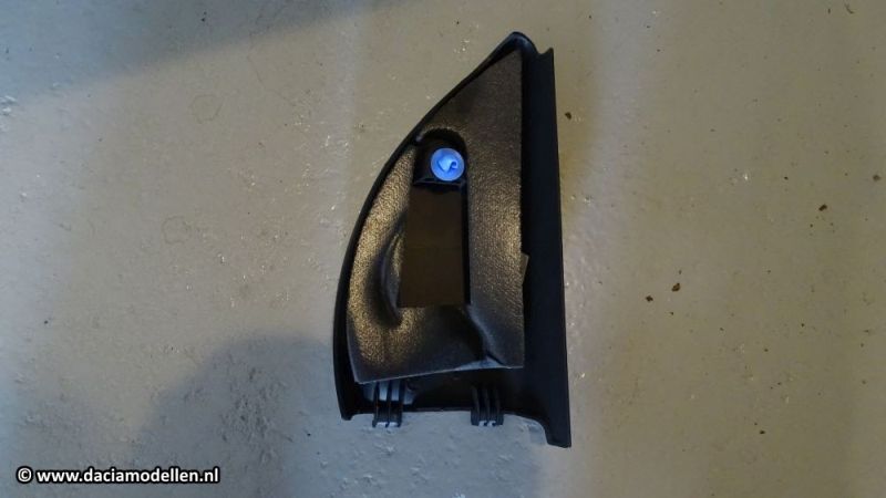 Bij de Lodgy begin je met de kunststof driehoek bij het raam van de voorportieren. Deze heeft 1 kunststof klem waarmee hij vastzit. Als je de driehoek aan de bovenzijde vastpakt dan kun je hem naar je toe trekken en gelijktijdig ook kantelen naar beneden. Aan de onderzijde zitten haakjes waarmee hij vastzit achter het grote paneel.