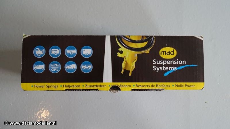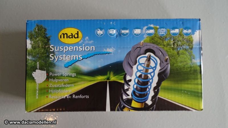 De oplossing die voor mij het beste leek waren de hulpveren van het merk MAD. Via de plaatselijke onderdelenhandel heb ik een set besteld. Via de site van MAD is eenvoudig na te gaan wat er voor welke auto leverbaar is. Voor de Lodgy is dat de set HV-140585. In de beschrijving van de set staat dat deze in 45 minuten te monteren is. En ik kan je verklappen dat dat niet gaat lukken als je geen beschikking hebt over een hefbrug en veel ervaring met dit soort werkzaamheden.