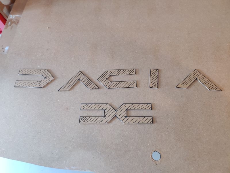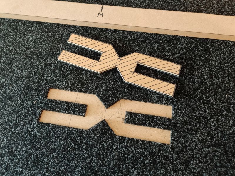 De werkwijze voor het logo is precies hetzelfde. Dus printen, uitsnijden, overtekenen op hout, uitzagen, twee keer gebruiken als sjabloon en daarna omwisselen van logo.