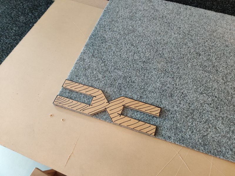 Aangezien de letters nu niet meer verschuiven heb ik de lat ook weggehaald. Nieuw scherp mesje in het hobbymes en vervolgens voorzichtig, in meerdere keren, langs de houten letters door de bekleding heengesneden. Zo ontstonden er uiteindelijk een aantal losse letters maar dan gemaakt van vloerbedekking in de kleur antraciet.