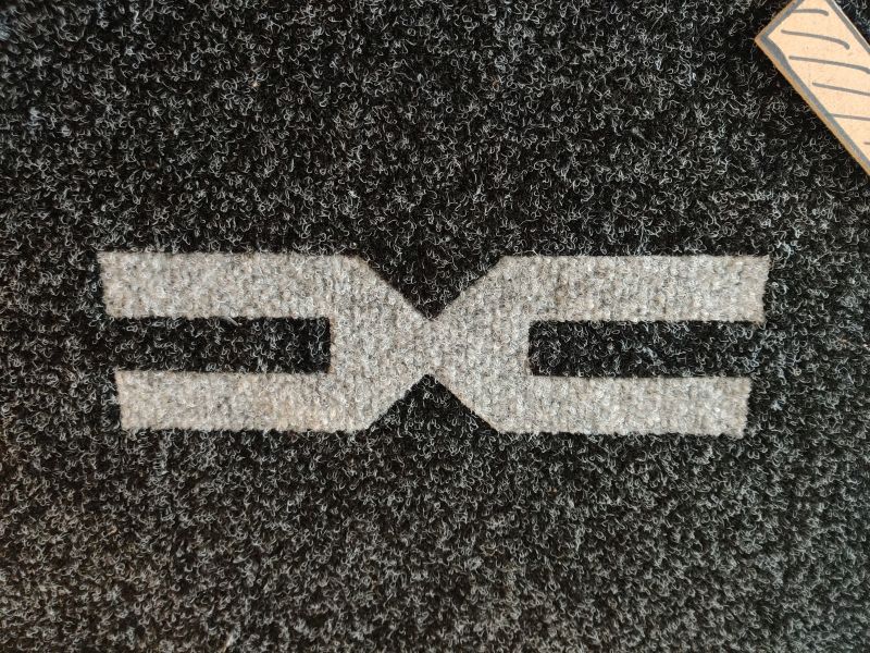 De lege plekken die onstaonden door het uitsnijden van de vloerbedekking in antraciet kon ik nu perfect opvullen met letters in de kleur grijs. Immers, De houten letters waarmee ik de ene set letters uit de vloerbedekking heb gesneden heb ik ook gebruikt om identieke letters qua grootte in een andere kleur uit te snijden. Deze letters passen dus perfect op de plak van de andere letters!