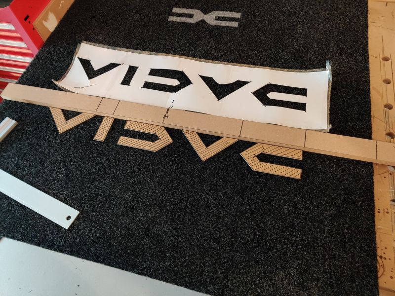 Toen was het tijd om de PC op te starten en het nieuwe logo en lettertype op het juiste formaat te printen. Eerst heb ik de letters apart geprint per A4, vervolgens deze A4tjes aan elkaar geplakt op de juiste afstand om de merknaam weer samen te stellen met de juiste letter-afstanden. Hierna was het tijd om de letters stuk voor stuk uit te snijden met een goed scherp hobbymes. Enerzijds kreeg ik hiermee losse letters, anderzijds ontstond zo een sjabloon om later weer te gebruiken.