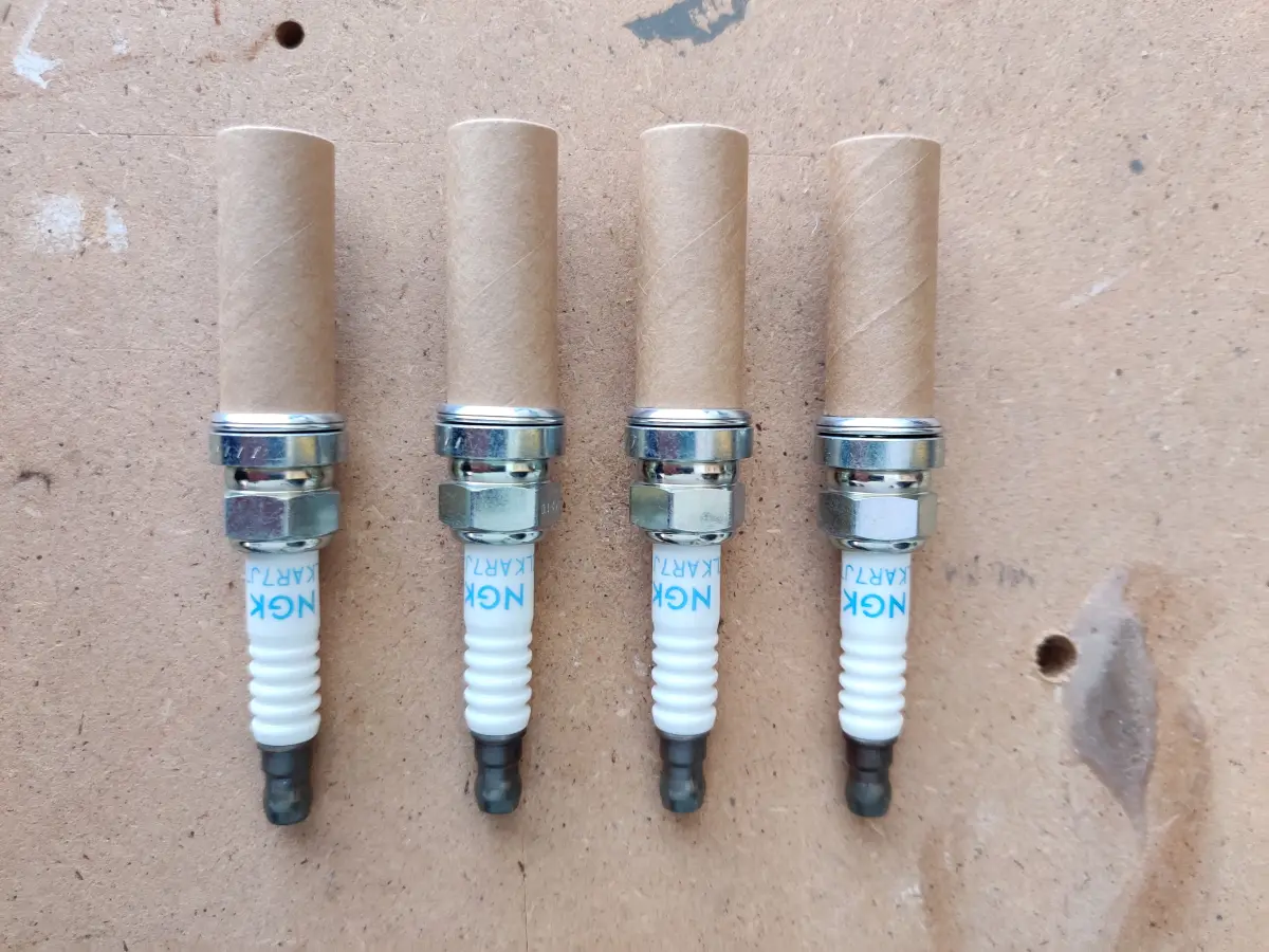 De nieuwe bougies worden geleverd met een kartonnen huls om de vonkbrug om te beschermen. Deze dient (bij dit type bougie) een electrodeafstand van 0,7mm hebben. Dit controleer je met een messing voelermaat.