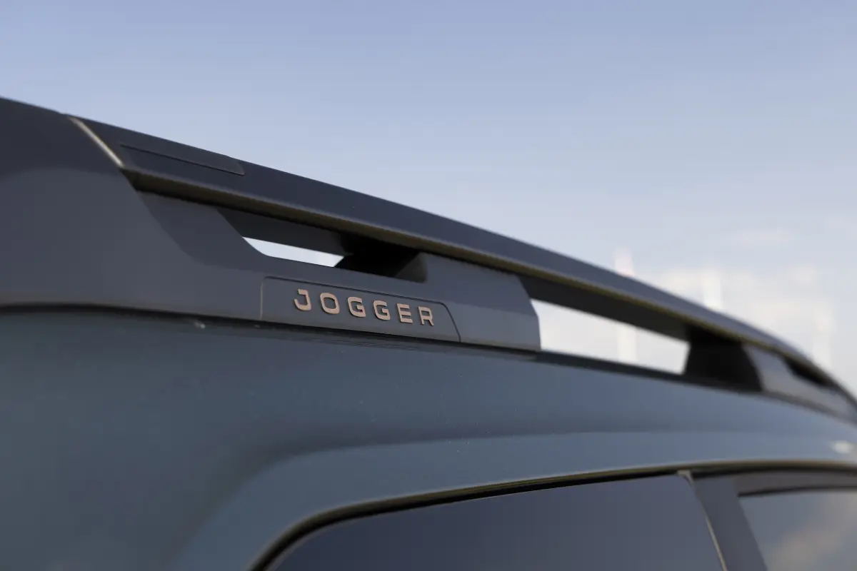 - 2. Koperkleurige tekst Jogger op de dakdragers