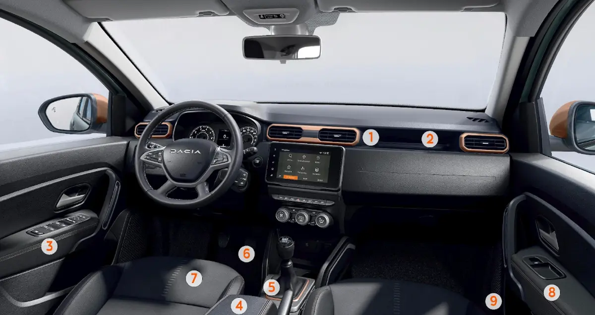 - 6. Koperkleurig Dacia logo op de naafdoppen