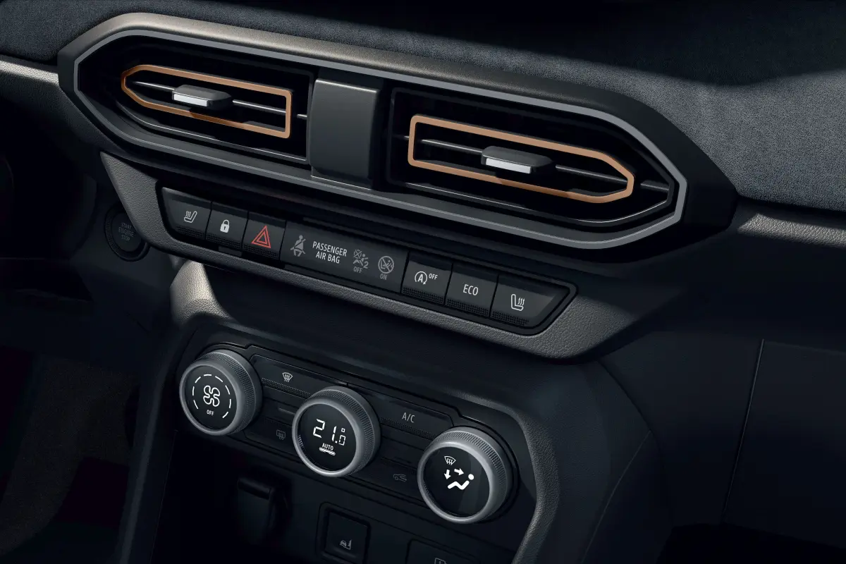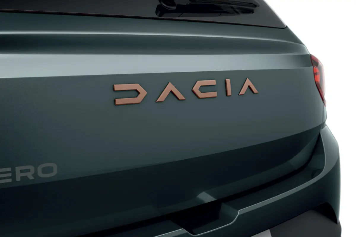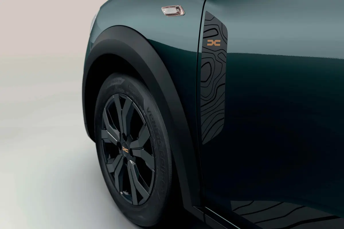 - Koperkleurige accenten op de buitenspiegelkappen en naafdoppen, evenals de belettering van de merknaam Dacia op de achterklep.