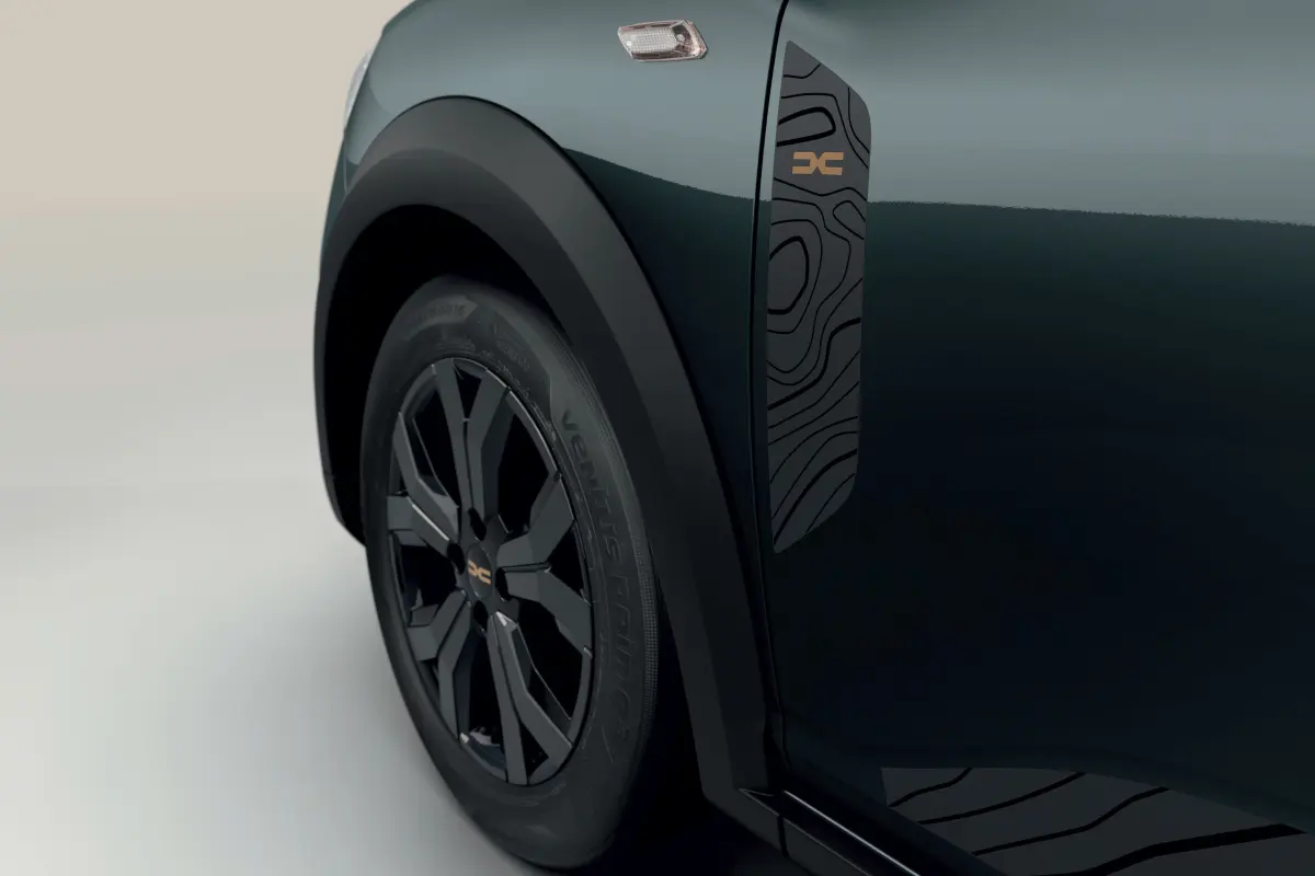- Striping in topografisch design op de voorportieren (de kenmerkende ‘snorkel’ tussen het voorspatbord en het voorportier van de Duster) voor de Spring, Sandero Stepway en Jogger.