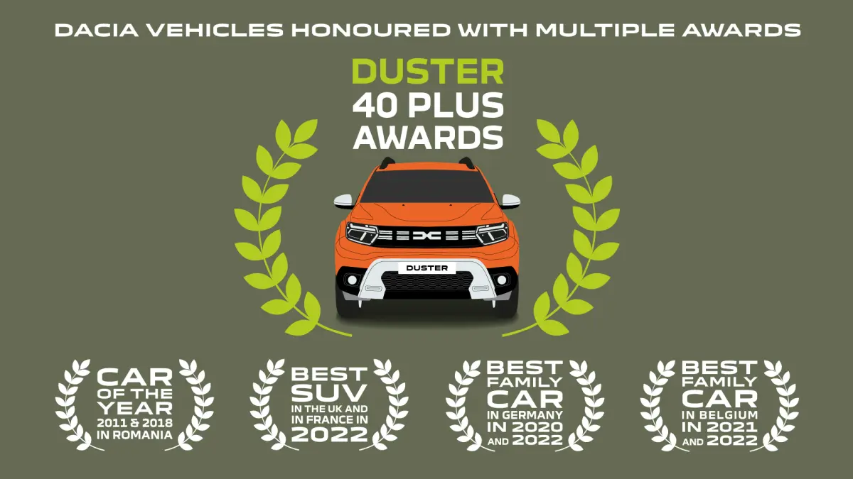 De Duster is het bestverkochte model van Dacia. De SUV wordt aangeboden voor prijzen vergelijkbaar met die van compacte modellen van andere merken. Hij is een vaste waarde in het aanbod van Dacia en ruim veertig keer onderscheiden. Zo werd de Dacia onder meer uitgeroepen tot ‘Auto van het Jaar’ in Roemenië, ‘Beste SUV’ in het VK en ‘Beste Gezinsauto’ in zowel Duitsland als België. De unieke zevenpersoons Dacia Jogger is anders dan elke andere auto en heeft al dertien onderscheidingen binnengesleept, onder meer de titel ‘Auto van het Jaar’ van het Franse automagazine l’Argus.